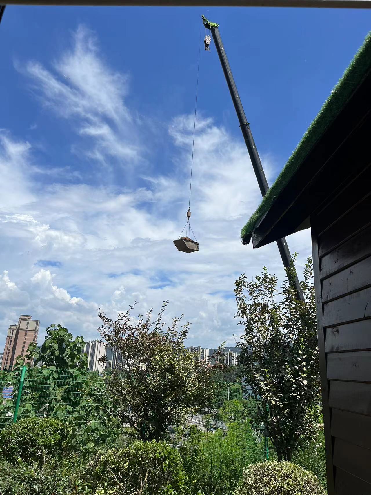 一辆45吨的吊机开始将水泥、石子运到山顶。