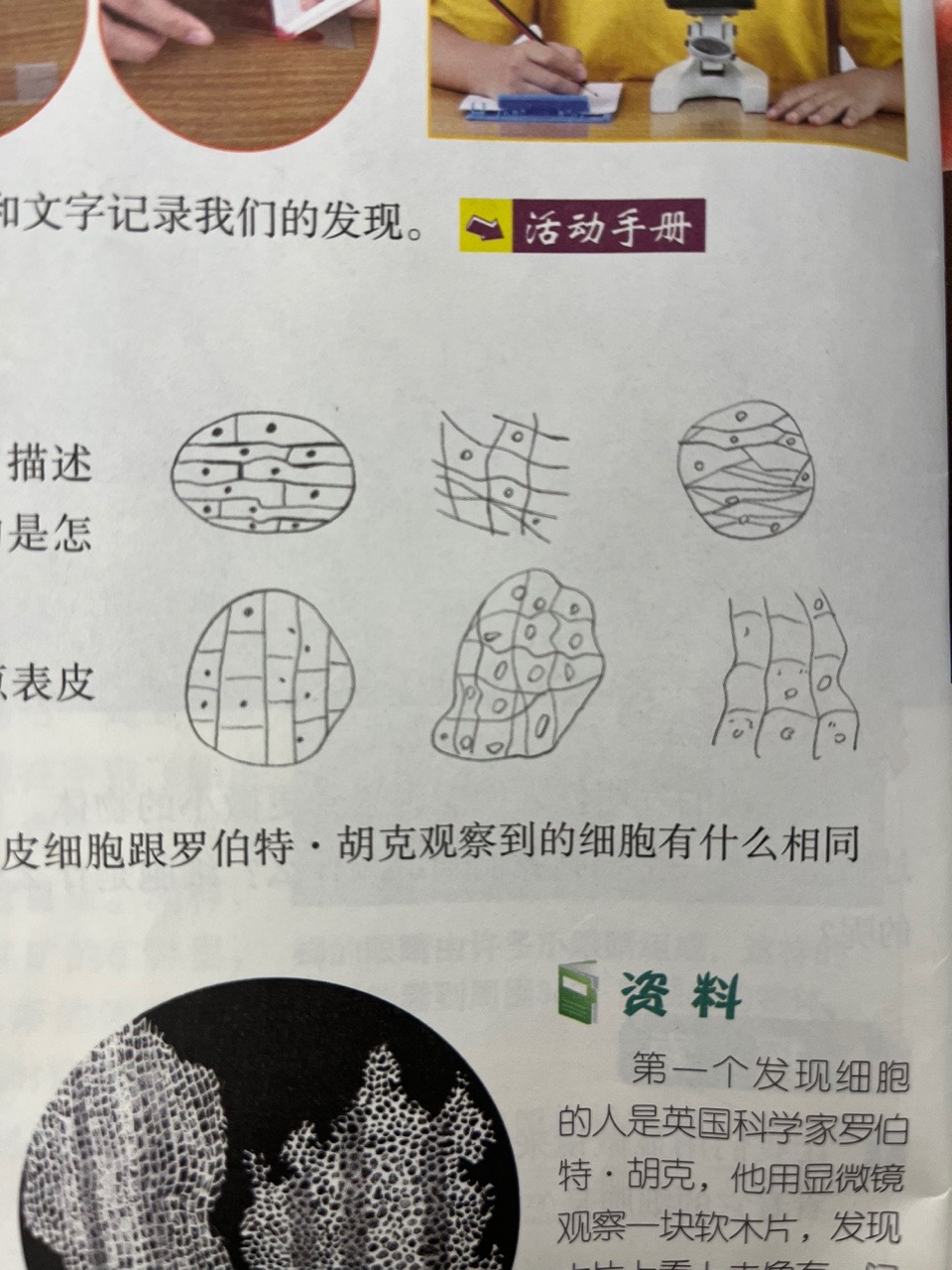 前一个班选用桂树的叶子,太硬了,叶肉细胞标本较难制作。没有光学显微镜,只有工具箱的简易手持显微镜,细胞壁不是很分明。但也看到了叶绿体。补充洋葱表皮细胞,这个材料真的很好,简易手持显微镜(100倍)也能看到细胞。