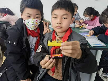 4.请学生先观察新元件及组装说明书。思考它们的用处,并尝试利用新的工具,完成一个简单电路的组装,点亮小灯泡。